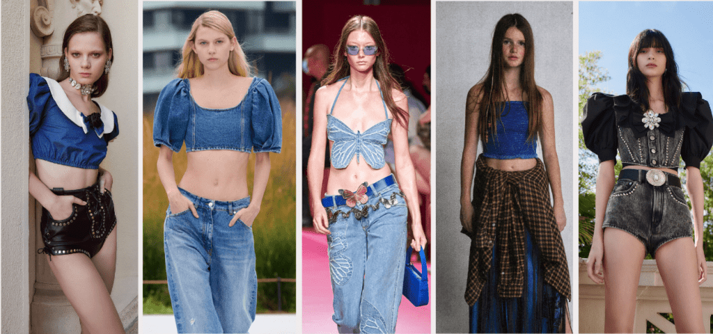 O top em jeans foi claramente influenciado pela estética y2k do ano 2000 e relembrado pelo movimento Free Britney, com seus looks extravagantes total jeans, com cropped e calças de cintura baixa.