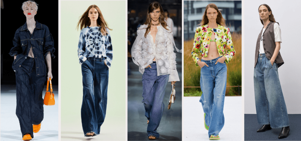 O shape wide leg vai continuar em alta. A calça vai ser sucesso no próximo verão. Com sua estética despojada e confortável, é perfeita para as composições mais frescas da estação. O délavé continua em alta, a novidade foi as lavagens escuras e o jeans em seu aspecto natural.